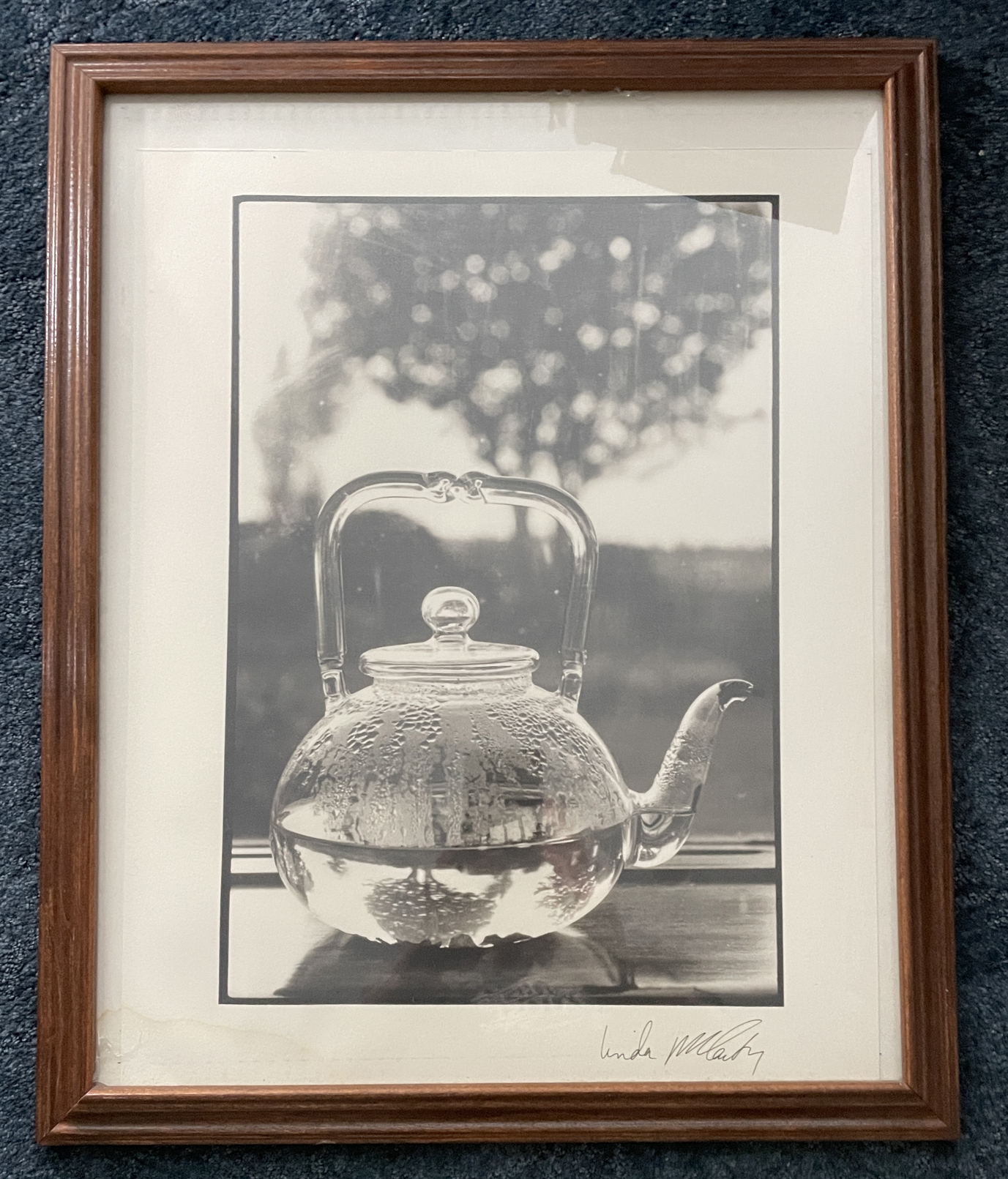 Linda McCartney, "Through a Glass Teapot", 1996, black & white 11" x 16" (outer mat dimensions approx. 14.5" x 18") fine art photograph SIGNED by the late Linda McCartney in pencil; depicting a tree as seen through a glass teapot sitting on a window sill. Well-known photograph that is illustrated in numerous places on the internet. For illustration for image, click here and here. Linda McCartney (formerly Linda Eastman) was married to Paul from the late 1960s until her death in 1998; she was a successful photographer as well as being a member of the post-Beatles group Wings which had several hit records in the early 1970s. Note on back says it was from Linda McCartney's estate; click here. This would make a great Christmas gift for any McCartney fan. Framed in plexi so it can be shipped with little risk of damage. Has a very faint water stain in the lower LH corner of the mat (see image); very faint and hard to see. Price $395 plus shipping; her prints are typically offered at several times that price.