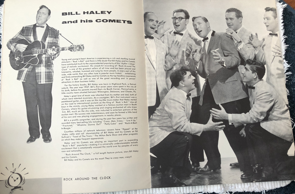 "Biggest Rock and Roll Show of 56," presented by Super Attraction, featuring early R & R pioneers including Bill Haley & the Comets, the Platters, Clyde Mc Phatter, La Vern Baker, Joe Turner, The Teenagers featuring Frankie Lymon, The Teen Queens, Bo Diddley, the Drifters, and others; 24-pp souvenir program with photos and bios of all the artists, plus color cardboard coves with photos, great images and graphics and in excellent condition, asking $100. For illustrations, click here, here, here, and here.