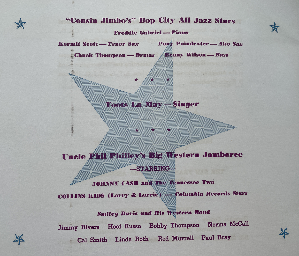 Show of Stars, San Quentin Prison, 1960, featuring Johnny Cash and the Tennessee Two(!) and a number of local musicians of various genres. 8" x 9" 16-page program for this annual event. Nice blue and purple cover with drawing of searchlights beaming up for from the prison. For illustrations, click here, here, here, and here. This is an early, unique, and undoubtedly very rare item. SPECIAL ADDED BONUS: A ticket to the San Quentin Tour Dinner and Show, on 11/20/1957 (see illustration). Condition of program is good; minor staining on cover, inside is in excellent shape, as is the ticket. Asking $100 for the set; once again, this is extremely rare.
