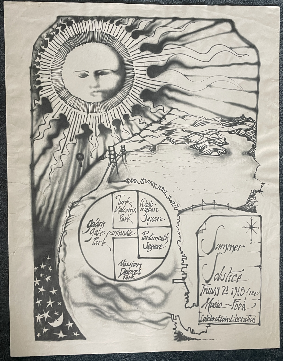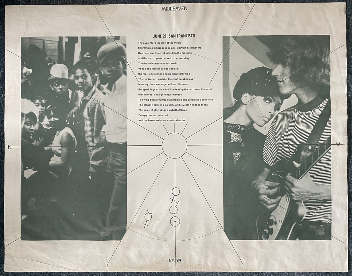 Summer Solstice Celebration, 6/21/1968, Golden Gate Park or Thereabouts, San Francisco, approx. 17.5" x 22.5" on fairly thin paper; one side shows a B & W airbrush image of the sun shining down on San Francisco, with a map of the Golden Gate Park/Panhandle area; for image, click here. The reverse has a poem and a couple of photos, one of Jorma Kaukonen and woman; for image, click here. This very uncommon poster is generally recognized to be the work of Stanley Mouse; unfortunately he did not sign it, but it is typical of his airbrush work of the period, and, in fact, the copy in my personal collection is personally signed by Mouse, thereby indicating that he confirmed the attribution. It looks like a quickie that he dashed off with his airbrush. This is a hard poster to find; somehow I ended up with two copies in my collection and am pulling out this one for sale; condition is VG+ overall; looks like there may have been a 1" edge tear repaired and possibly some similar minor conservation, but I don't recall when; slight rippling to the paper but overall pretty clean; check out the illustrations. Asking $395. An interesting item for the Mouse completist.