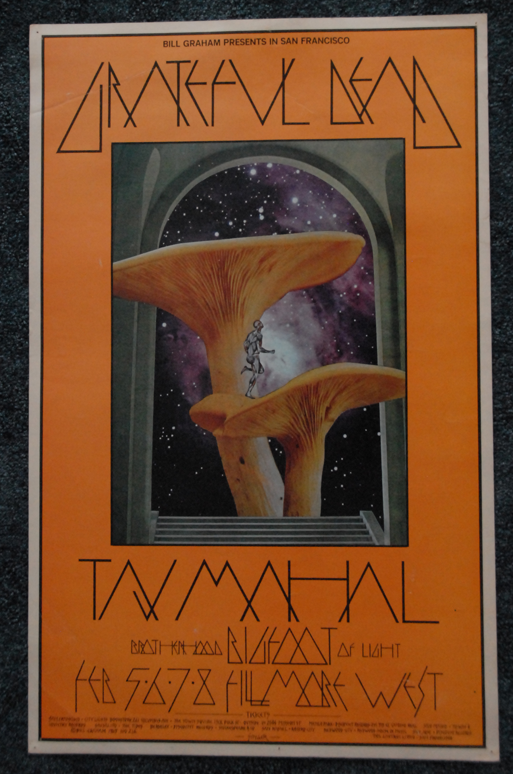 BG #216, Grateful Dead, Taj Mahal, Bigfoot, 2/5-8/70, Fillmore West; very popular David Singer poster featuring a dark yellow background, center collage of a skeleton standing on a mushroom, with a purple sky in the background. I am offering 2 copies of the scarce FIRST PRINTING showing the little irregular line in the RH corner of the image that is Eric King's diagnostic indicator of the first printing, for image, click here. Copy #1 is an outstanding NM copy (my former collection copy), basically as clean as they come! Asking $1,100 for this copy, which is very fair given the outstanding condition. Copy #2 grades a solid VG+ but has some minor defects, specifically corner tack holes outside the image, a diagonal crease in the upper LH corner of the image, and a couple of other minor marks that I don't think are particularly significant. Overall I would say that this is a clean, decent copy but not a near mint one. I have included a number of images of this poster which you can access by clicking here, here, here, here, and here. Asking $750 for this copy. (*)