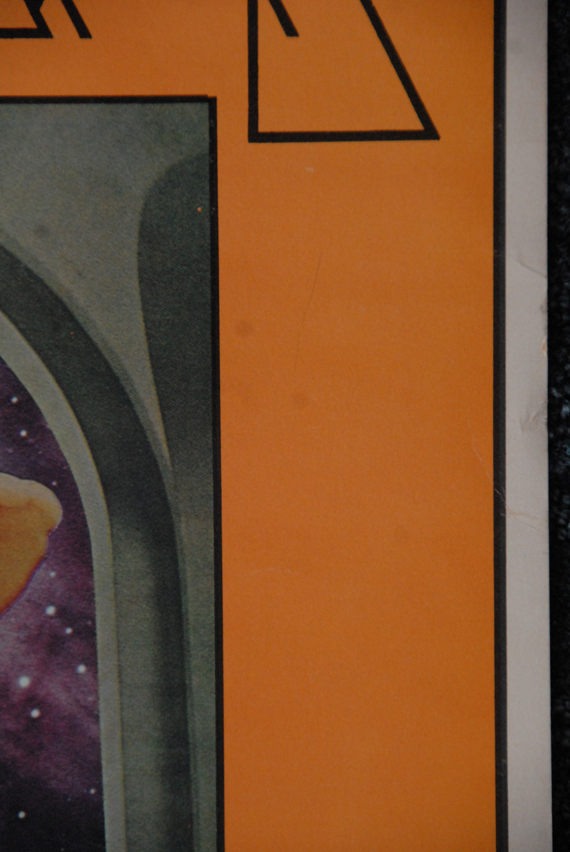 BG #163, Spirit, Ten Years After, Country Weather, 3/6-9/69, Fillmore West; orange/purple/pink Lee Conklin design with chair with arms that look like human arms and legs that look like human legs; great image. VG+/VG, no pinholes but has what looks like white scratch marks along the purple margin on the RH side outside the image; would frame up OK, $77.