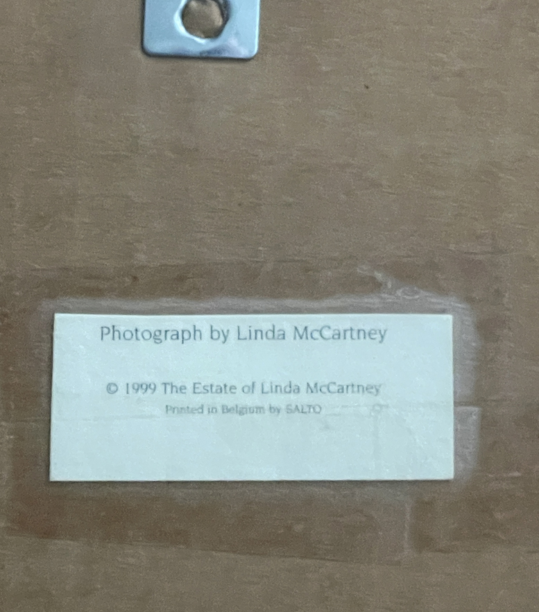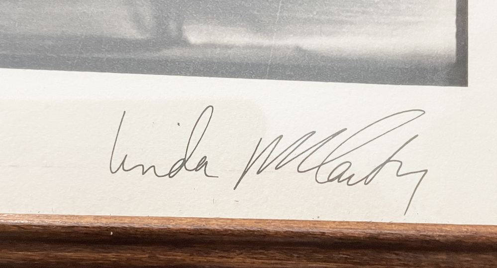 Linda McCartney, "Through a Glass Teapot", 1996, black & white 11" x 16" (outer mat dimensions approx. 14.5" x 18") fine art photograph SIGNED by the late Linda McCartney in pencil; depicting a tree as seen through a glass teapot sitting on a window sill. Well-known photograph that is illustrated in numerous places on the internet. For illustration for image, click here and here. Linda McCartney (formerly Linda Eastman) was married to Paul from the late 1960s until her death in 1998; she was a successful photographer as well as being a member of the post-Beatles group Wings which had several hit records in the early 1970s. Note on back says it was from Linda McCartney's estate; click here. This would make a great Christmas gift for any McCartney fan. Framed in plexi so it can be shipped with little risk of damage. Has a very faint water stain in the lower LH corner of the mat (see image); very faint and hard to see. Price $395 plus shipping; her prints are typically offered at several times that price.